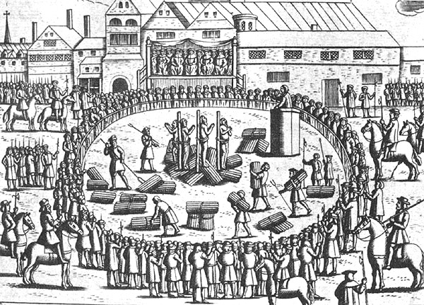 The manner of burning Anne Askew, John Lacels, John Adams & Nicolas Beleman, with certain of the council sitting in Smithfield, illustration from ‘Acts and Monuments’ by John Foxe, ninth edition, pub. 1684 (litho), English School, (17th century) / Private Collection / The Stapleton Collection / Bridgeman Images. This cropped version from the Tudor History website.